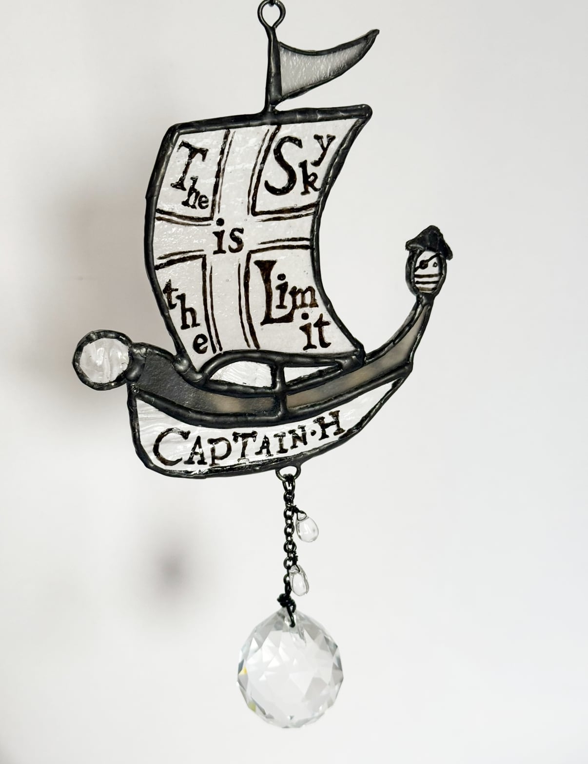 帆船をモチーフにしたステンドグラスのオブジェに、ガラス玉を吊るしたサンキャッチャーです