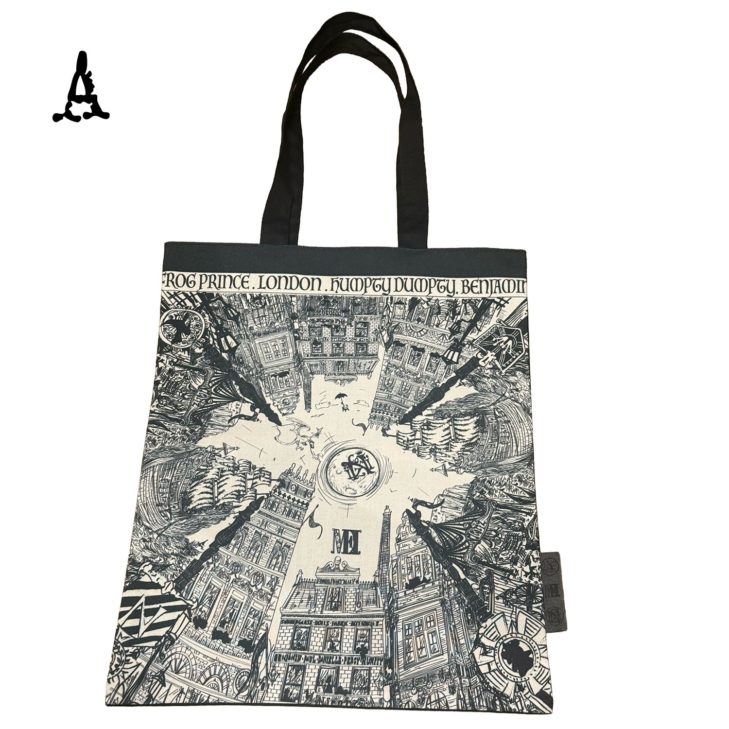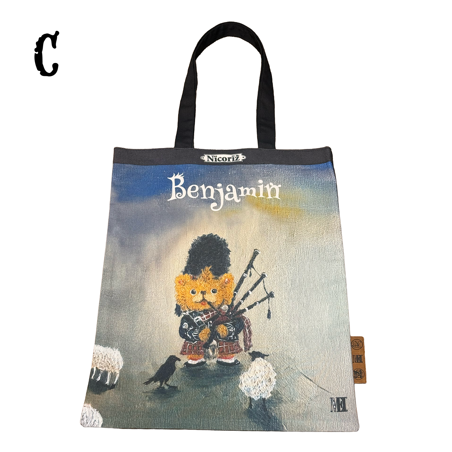 ニコライズの一角にある星空画廊の原画(MEI画)より、くまのBenjamin、かえる王子の肖像画などをプリントした手作りのオリジナルトートバックです