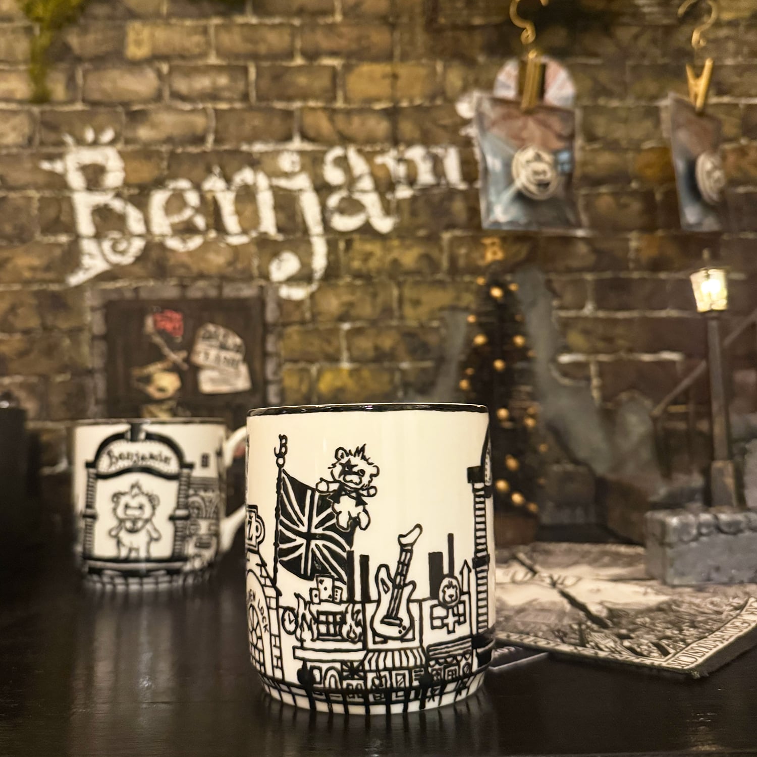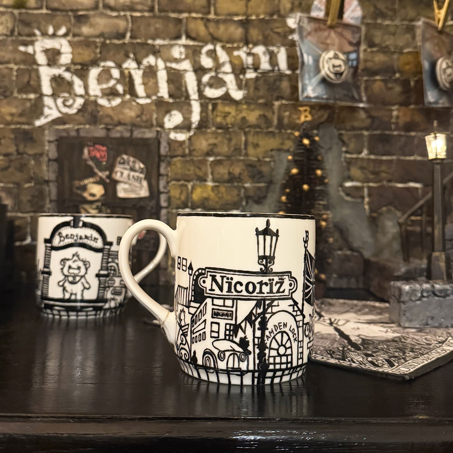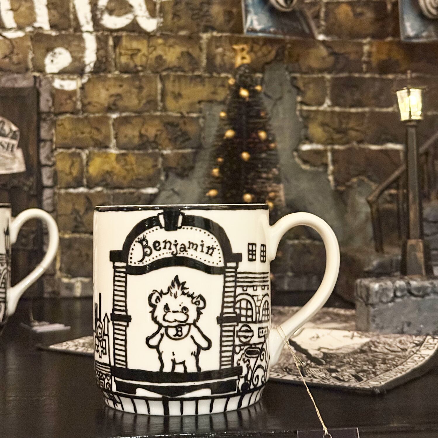 隠れ家雑貨店ニコライズの人気者、くまのBenjaminがロンドンを探検しているデザインをひとつひとつ手描きし、焼き付けた実店舗でも人気のオリジナルのマグカップです